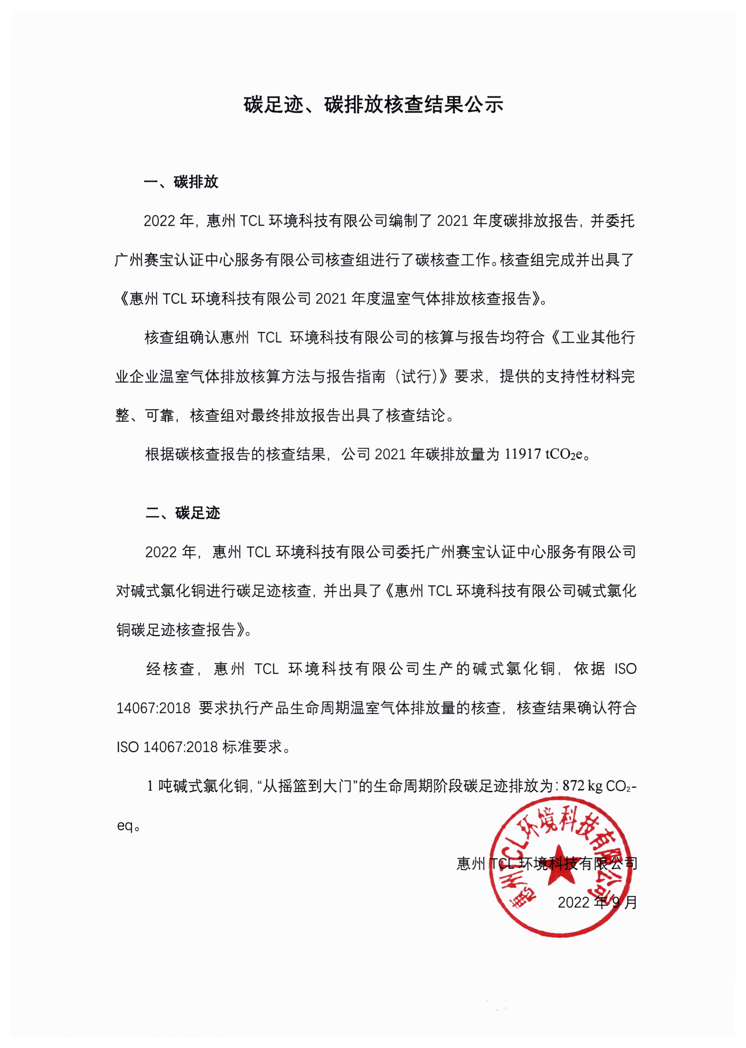 惠州TCL环境科技有限公司碳足迹、碳排放核查结果公示